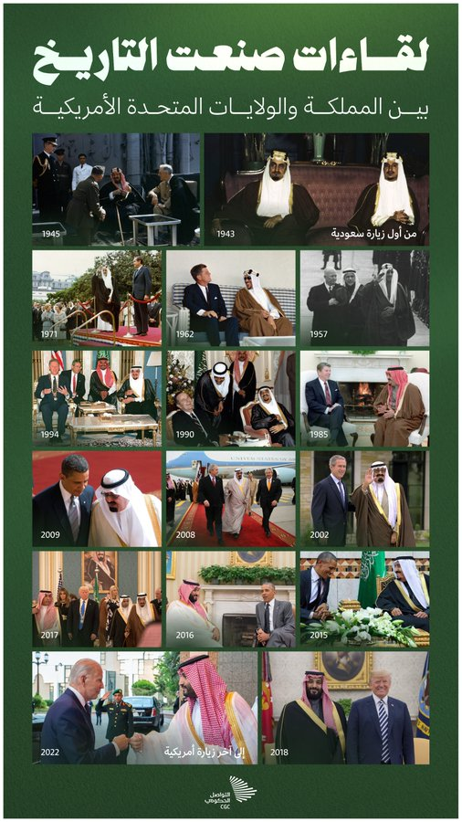 This visual timeline showcases some of the most iconic and strategic meetings between leaders of the Kingdom of Saudi Arabia and the United States of America, reflecting decades of diplomatic ties, mutual cooperation, and shared interests.